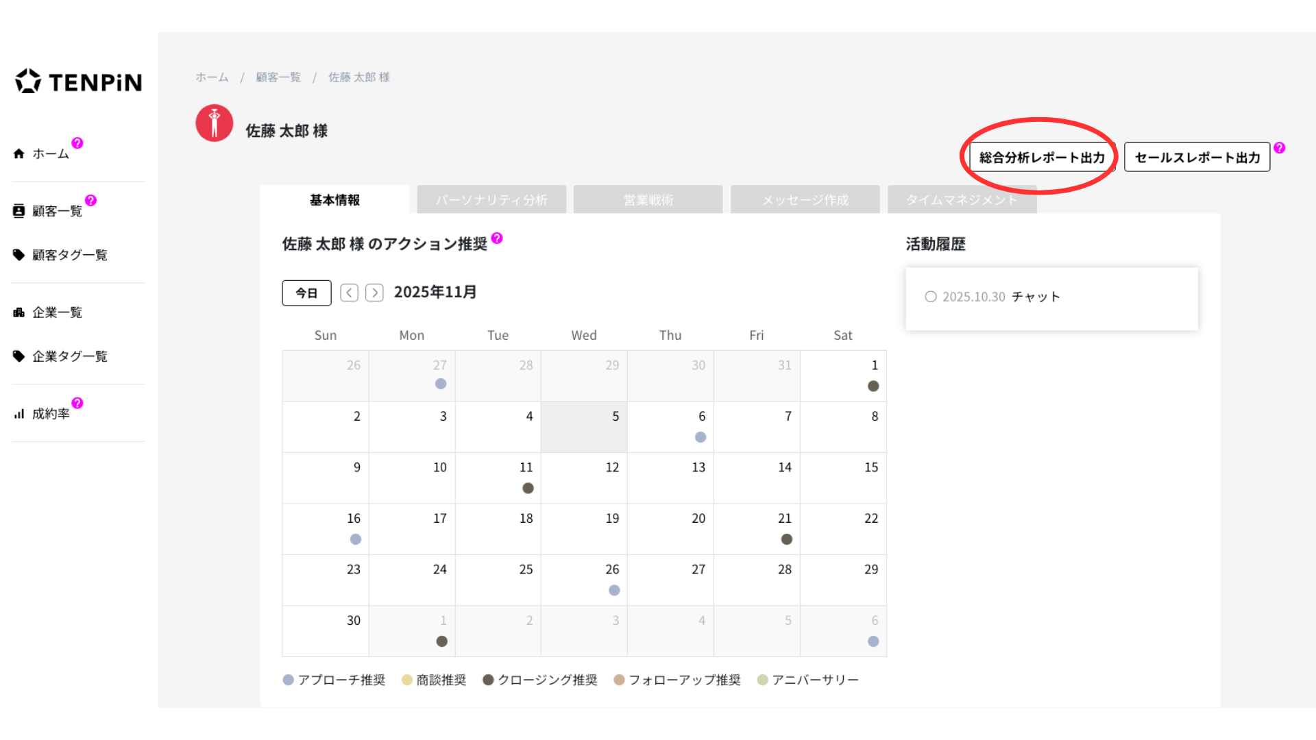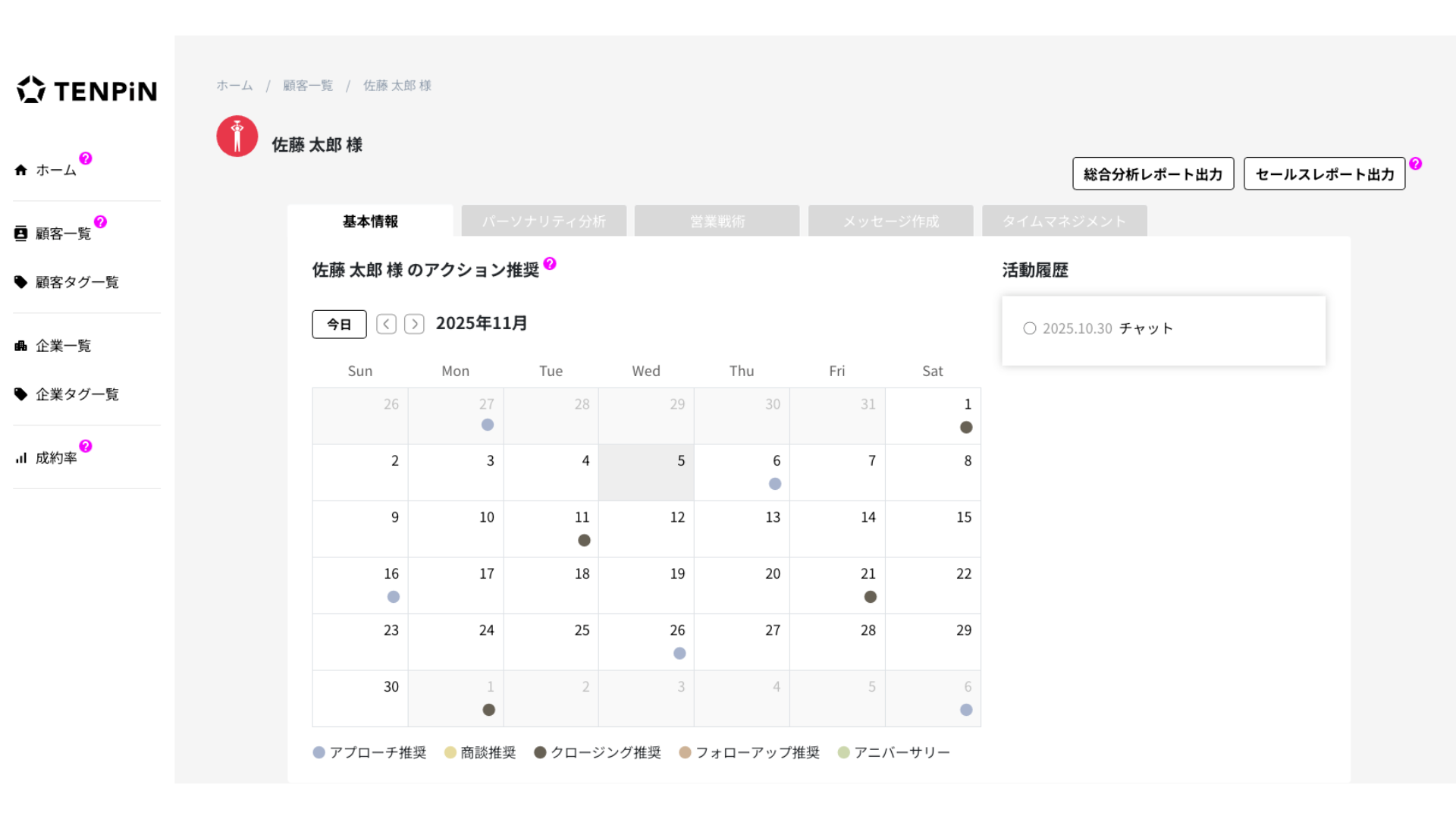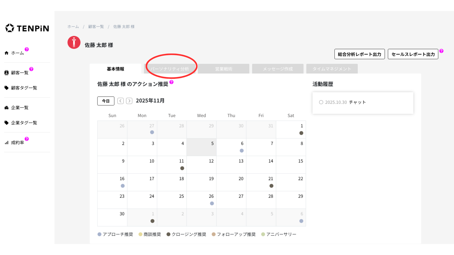 TENPiNのセールスレポート(パーソナリティ分析)は、顧客の生年月日から性格や意思決定傾向を分析し「どんな伝え方が響くのか」「どのタイミングで動くのか」をデータで可視化する機能です。