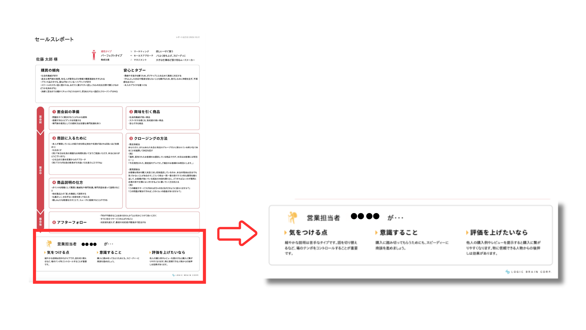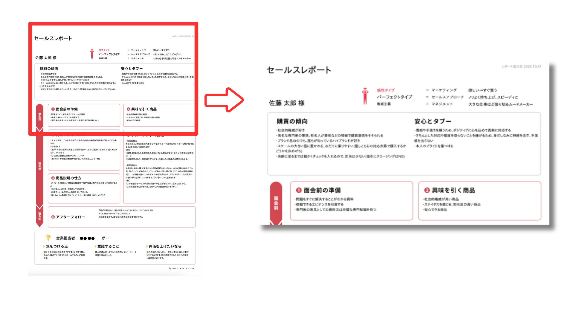 セールスレポートは、面会の会話の進め方やクロージングの方法まで具体的に提案します。たとえば、佐藤太郎様のセールスレポートをみると、商談前に心を込めた褒め言葉から入るとスムーズに商談を進めることができるとわかります。