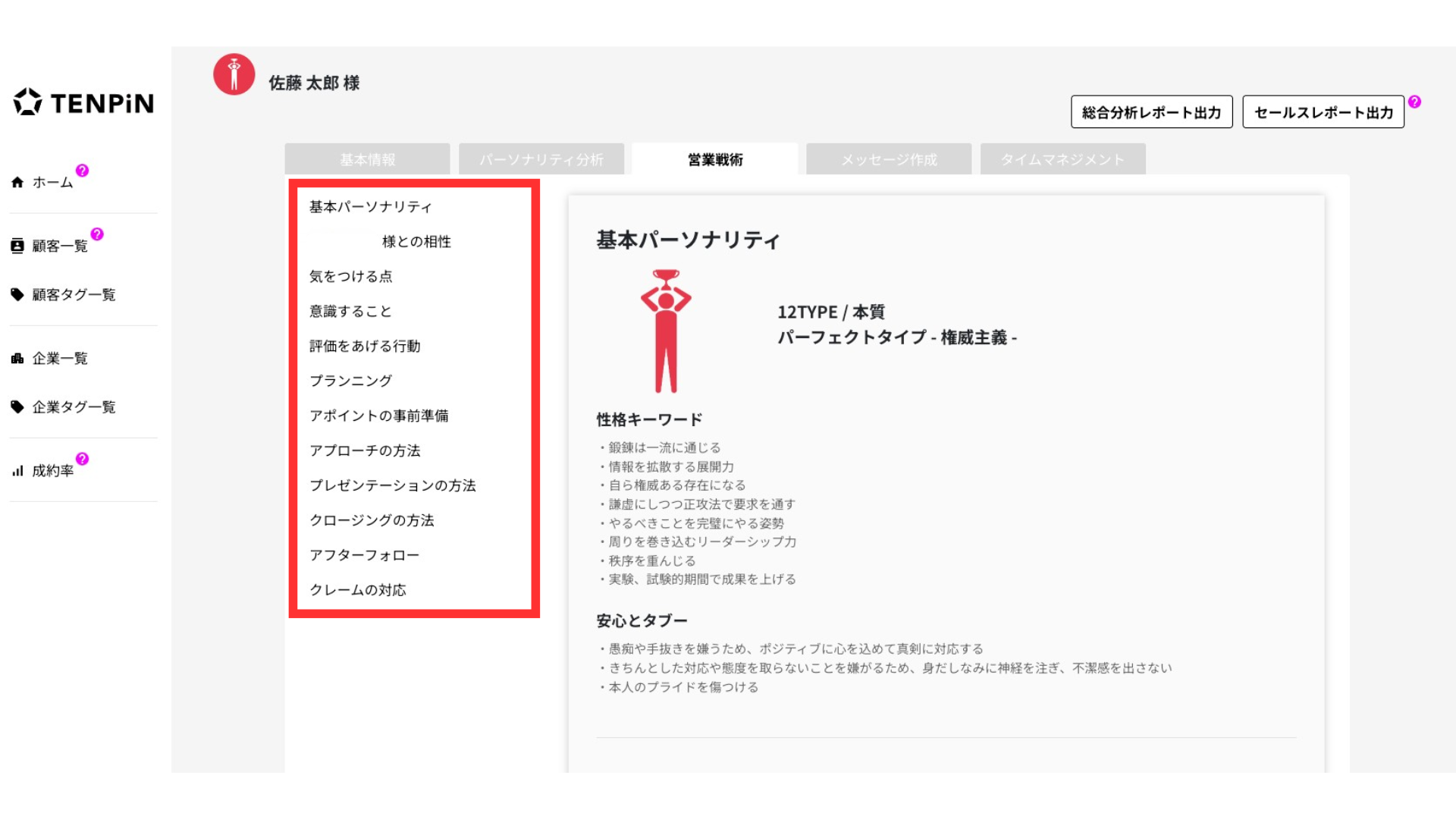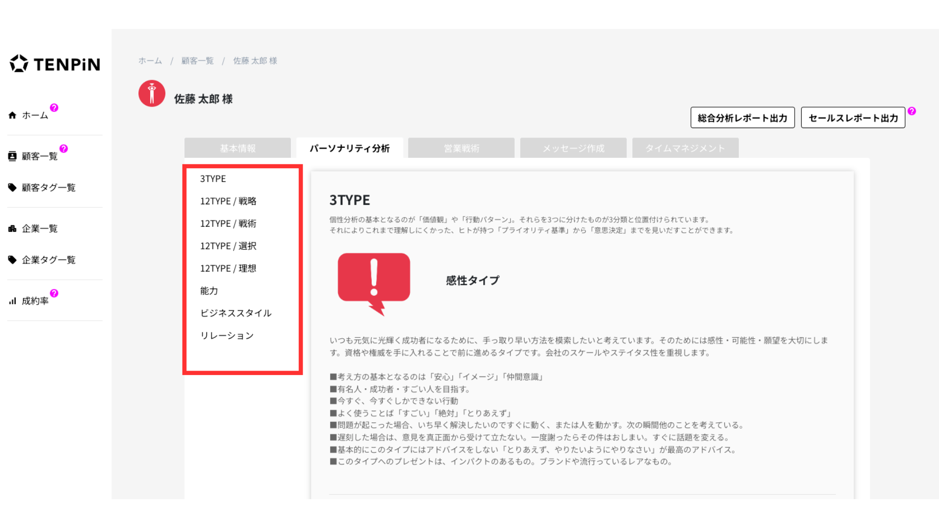セールスレポートでは冒頭に顧客の3タイプと12タイプがすぐに確認できるように、提示しています。例えば、下記の佐藤太郎のセールスレポートをみると、3タイプが感性タイプ、12タイプがパーフェクトタイプだとわかります。そのためTENPiNを立ち上げなくても、顧客がどのタイプなのか?どのような購買の傾向があるのか、またどのような行動や言動が相手に不快感を与えるのかをすぐに確認することができます。