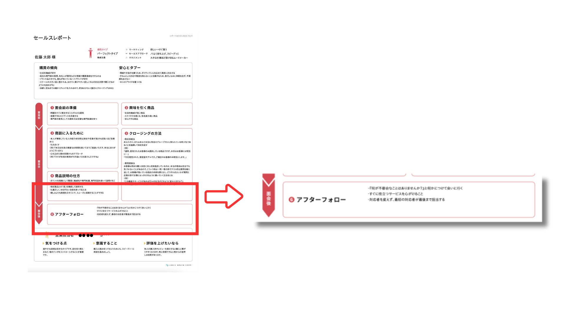 さらにセールスレポートでは、商談前の準備だけでなく、面談中・面談後のフォロー戦略まで網羅しています。そのため、どのように提案を進め、どのタイミングで決断を促すか、購入後の関係性をどう深めるかまで、一連の営業プロセスを顧客ごとに設計が可能です。