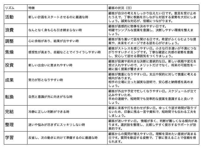 はやみ|TENPiNの独自分析により対象者のリズムが、年、月ごとに表示されます。リズムは全部で10種類あります。顧客のリズムを知ることで、好調期、低調期のサイクルやその時どのような現象が兆候が起こりうるか把握できます。それゆえリズムを意識して営業活動を行うことで、成約率や売上アップが期待できます。