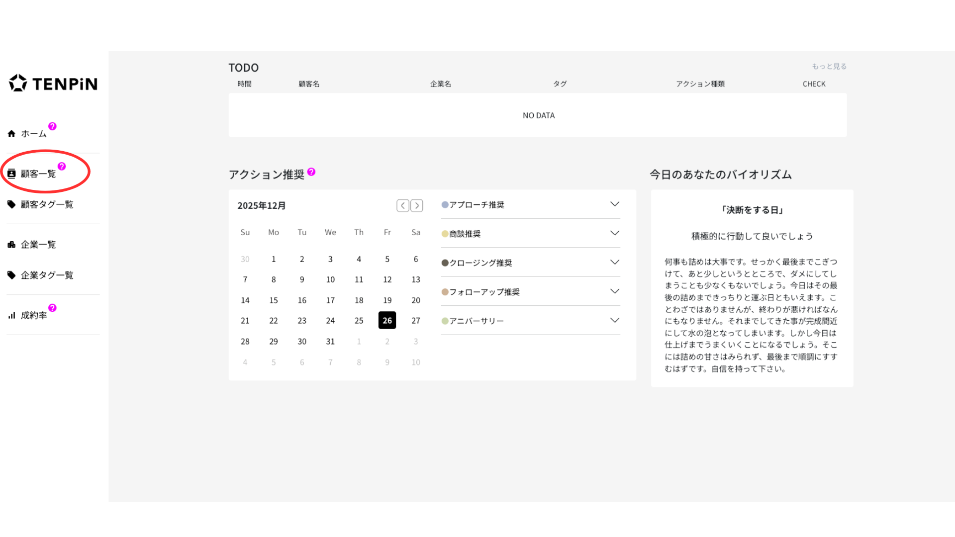 例えば、2025年1月の場合、アプローチをするのに最適な日が、5日、15日、25日だとわかります。15日にメールを送りたい場合は、忘れないようにするためにTO DO管理機能を活用して、タスクを作成しておくといいでしょう。