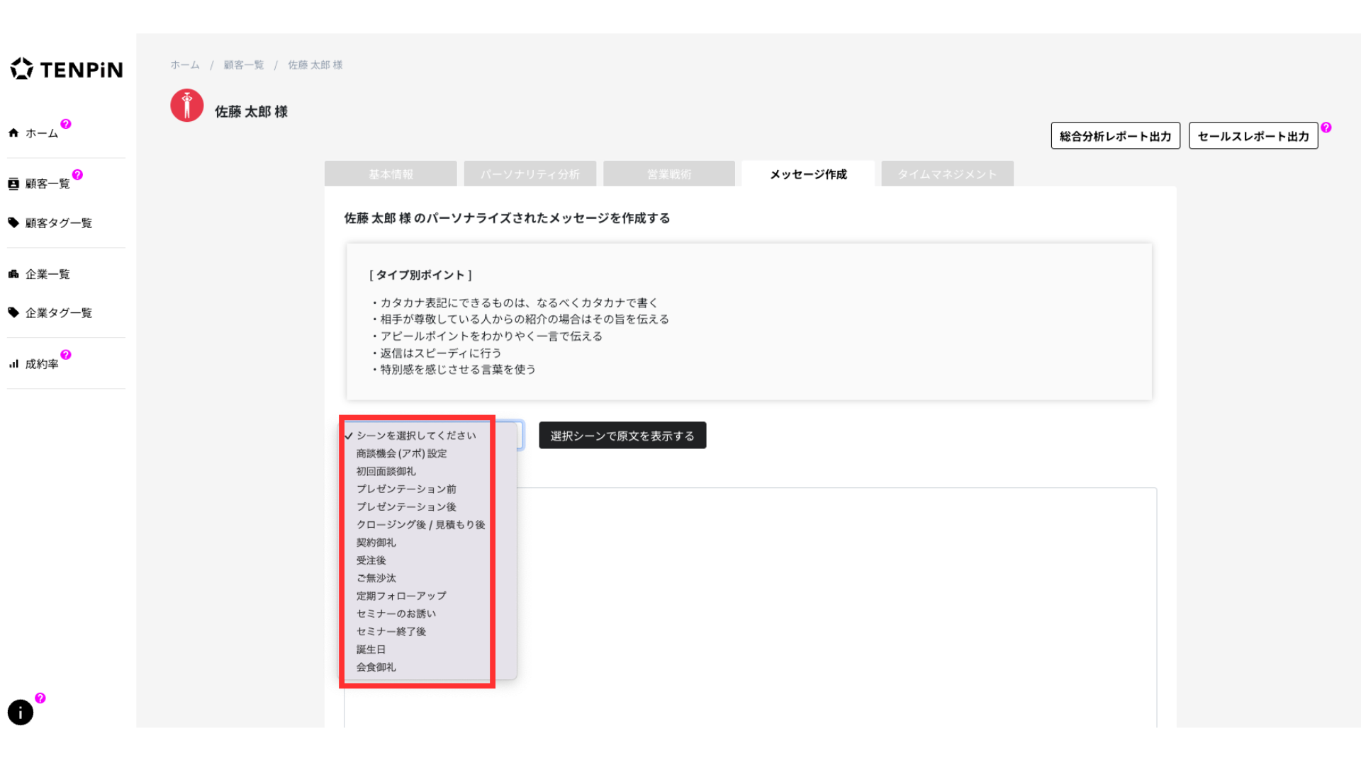 たとえば「面談後に熱量を下げたくないとき」「しばらく連絡が途絶えた相手に自然に再アプローチしたいとき」などです。顧客のタイプに基づいた「連絡する正当な理由」をTENPiNが作ってくれるため、営業担当者の心理的ハードルを下げ、関係性を前進させることができます。
