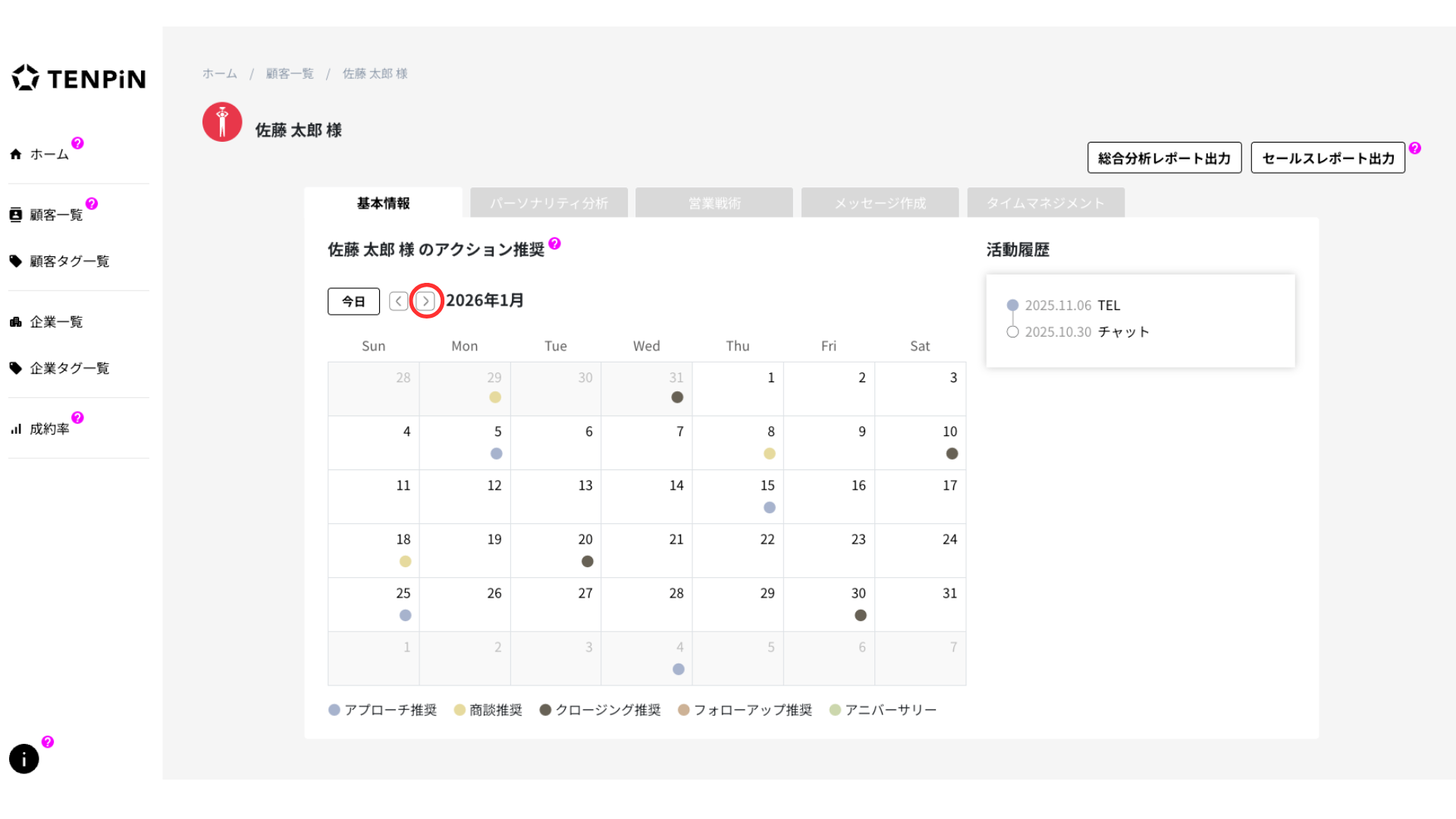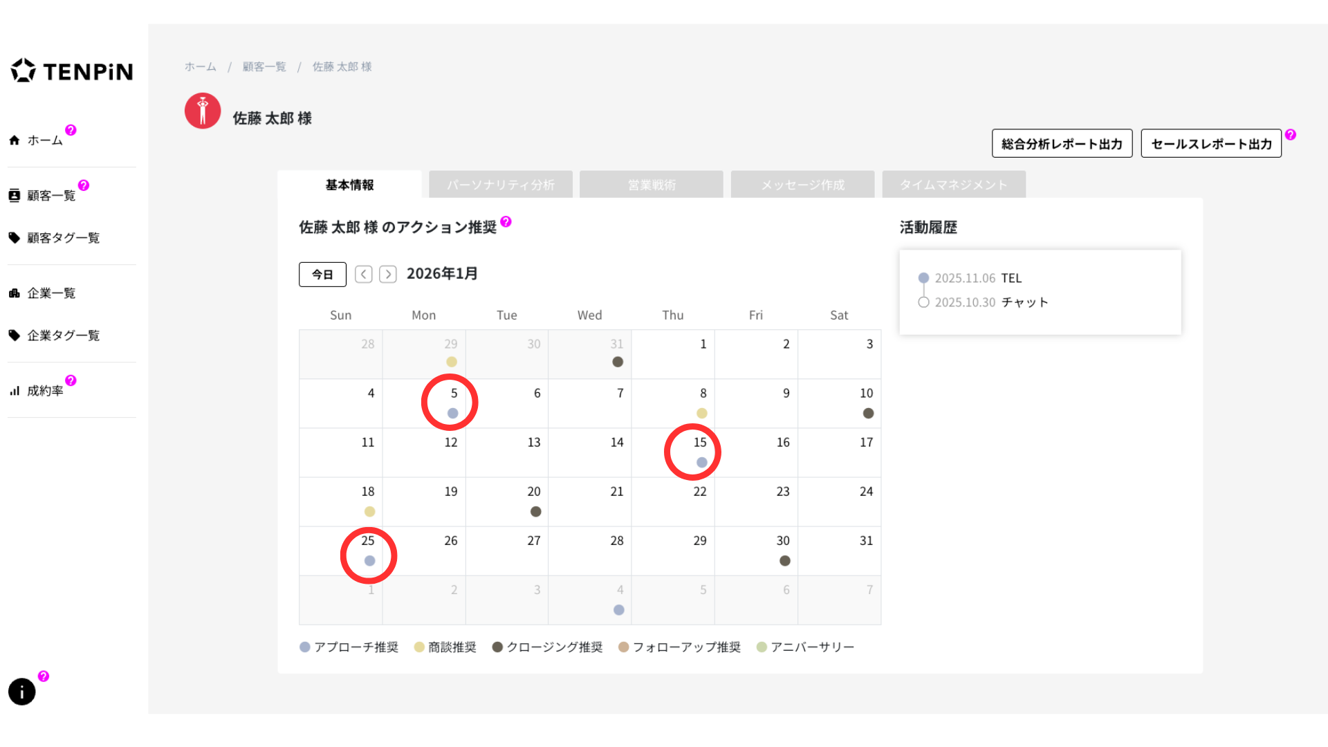 TENPiNの独自分析により対象者のリズムが、年、月ごとに表示されます。リズムは全部で10種類あります。顧客のリズムを知ることで、好調期、低調期のサイクルやその時どのような現象や兆候が起こりうるか把握できます。それゆえリズムを意識して営業活動を行うことで、成約率や売上アップが期待できます。
