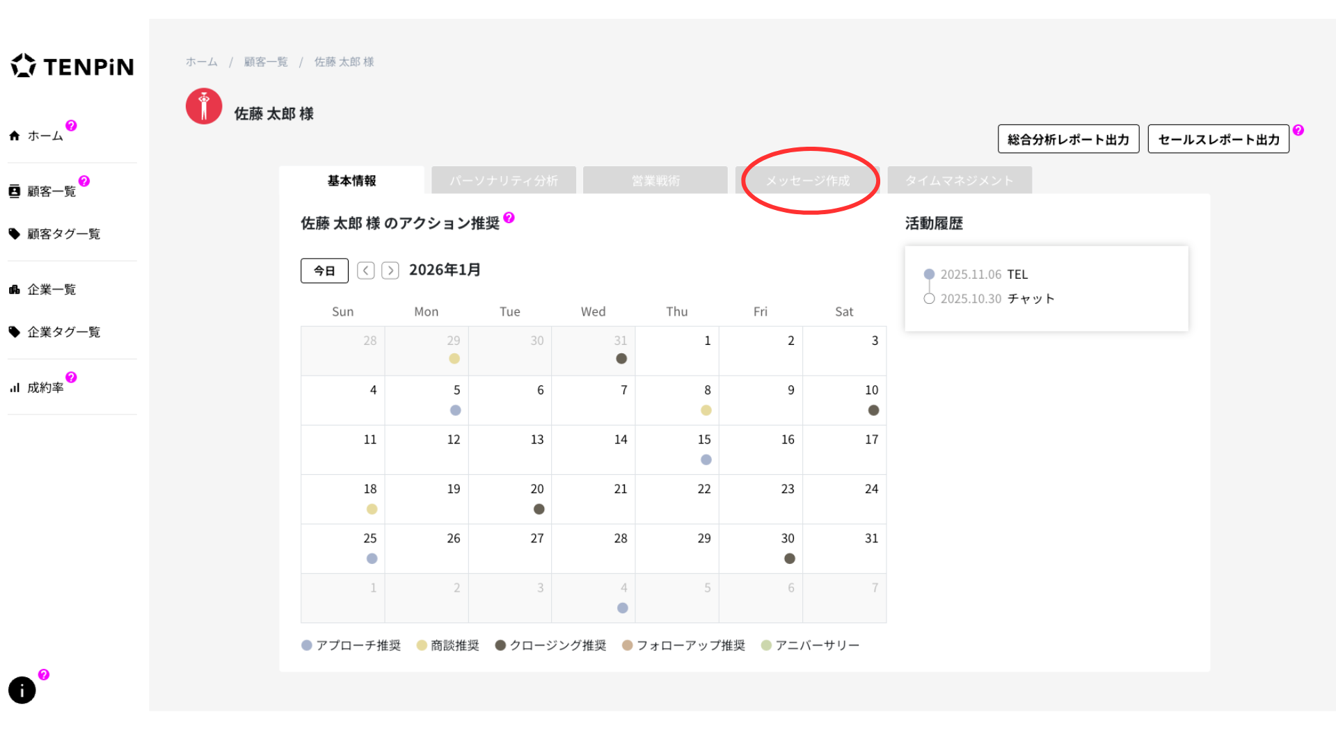 はやみ|次は、TENPiNのメール自動作成機能を活用して、佐藤太郎様へのメールを作成します。顧客の詳細画面から「メッセージ作成」をクリックします。
