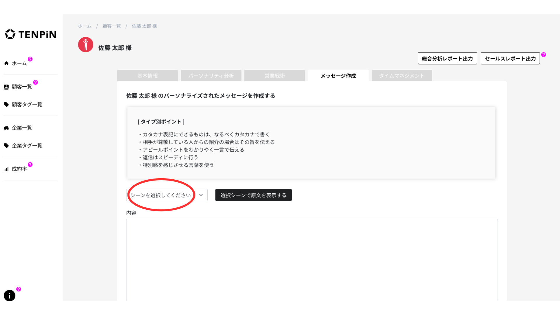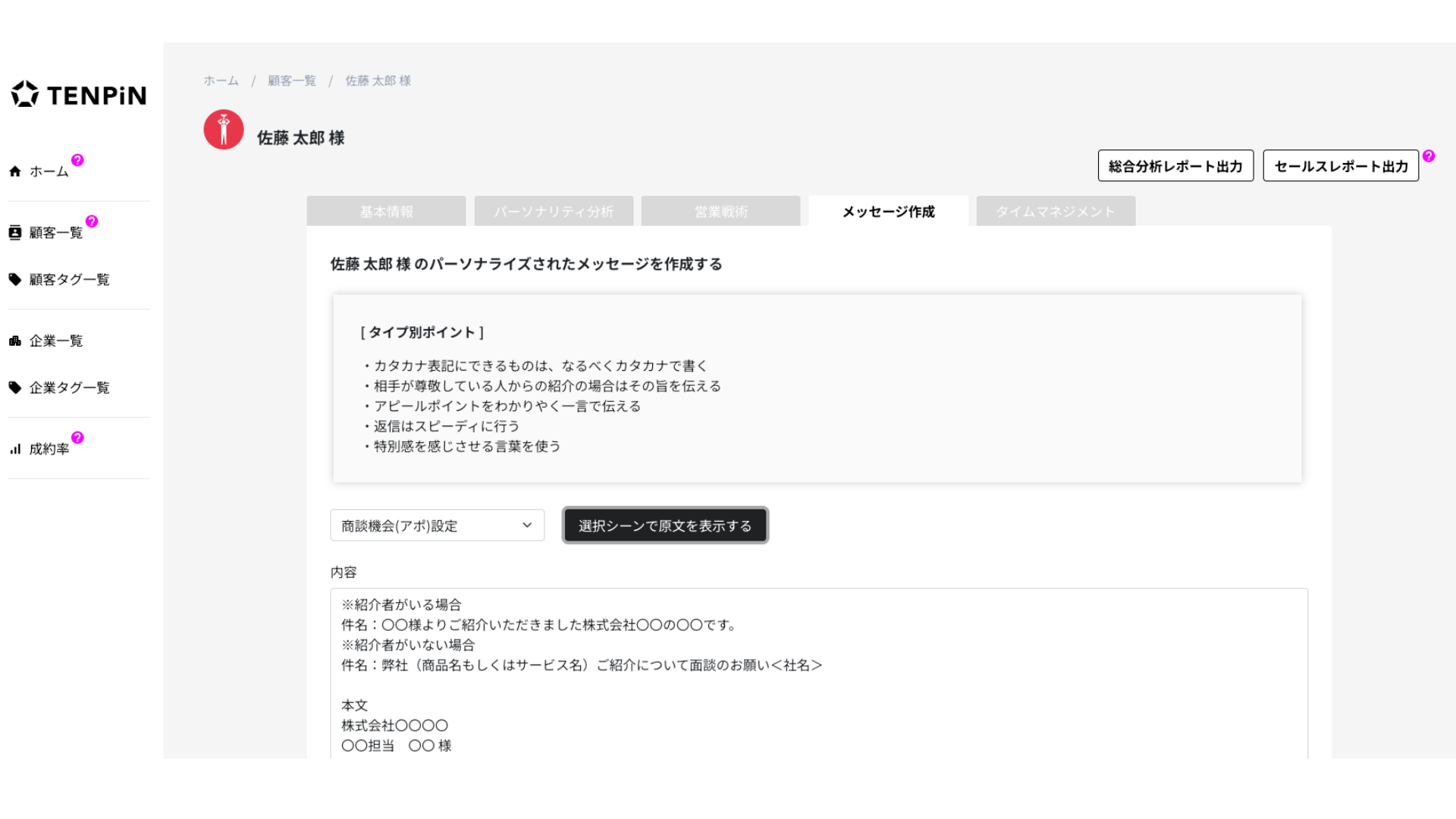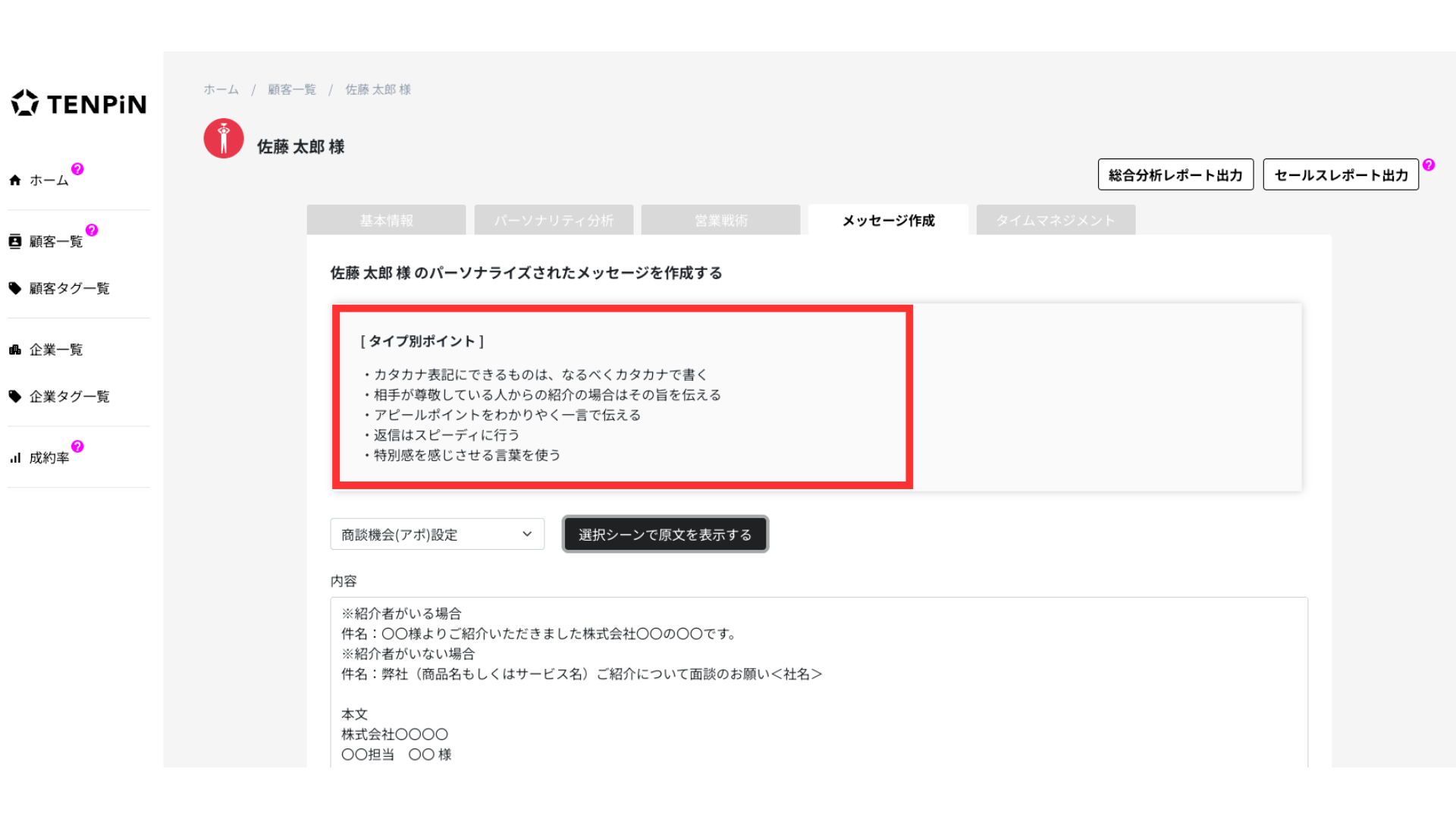 TENPiNは、100万人以上のデータに基づき、顧客一人ひとりに最適な「言葉選び」と「構成」を自動で提案します。自分一人の頭では思いつかないような、相手に寄り添った文章が瞬時に完成します。