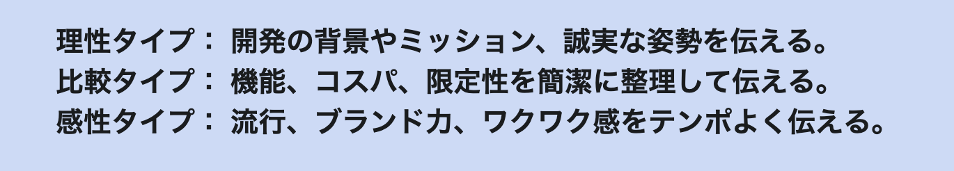例えば、同じ「新製品の案内」でも、相手によって届くポイントは全く異なります。