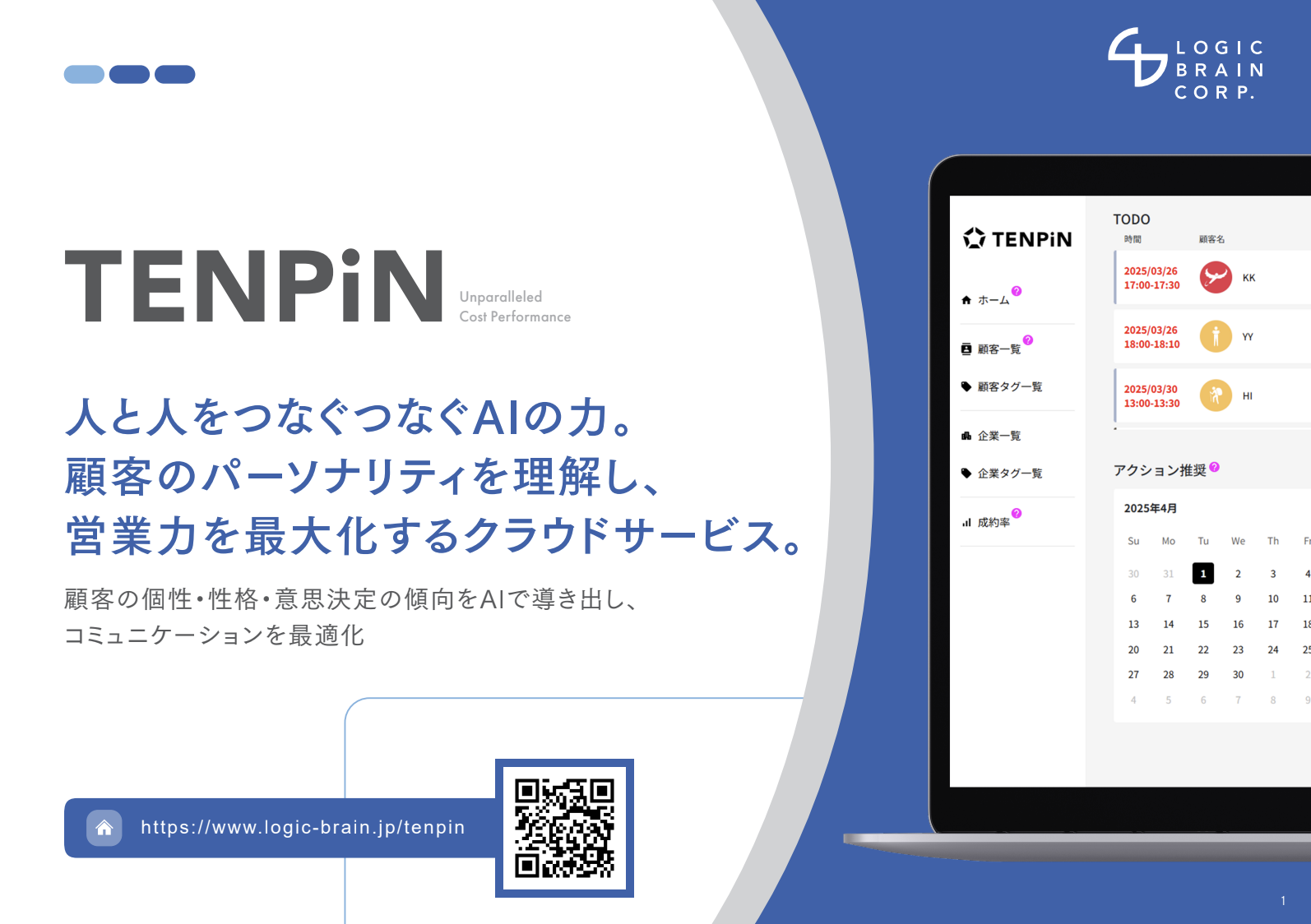 TENPiNは株式会社ロジック・ブレインが開発提供している、お客様の個性を分析し、ビジネスの拡大・成長につなげるクラウドCRMシステムです。生年月日を入力するだけで、営業やマーケティングで成果をあげるために必要な顧客情報を提供します。それにより自社の営業やマーケティングを支援します。